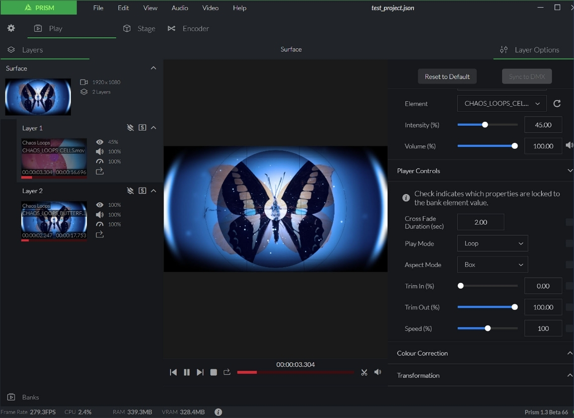 Not only does this new release offer Multiple Layers and Multiple Banks, but in addition users can now take advantage of Preview Window[, Cross Fade duration and Speed Control. The increased layer count in Prism allows for greater creativity and flexibility within the mix, giving you more choice over where your content sits. Multiple banks bring much more of your content under your control as well as the ability to import and export existing banks between projects. Prism’s new preview window allows you to easily prepare and adjust media before being live in the mix and set unique characteristics for each piece of content. Improved cross fade and speed control give additional functionality to further adjust your media playback and tailor it to specific needs.