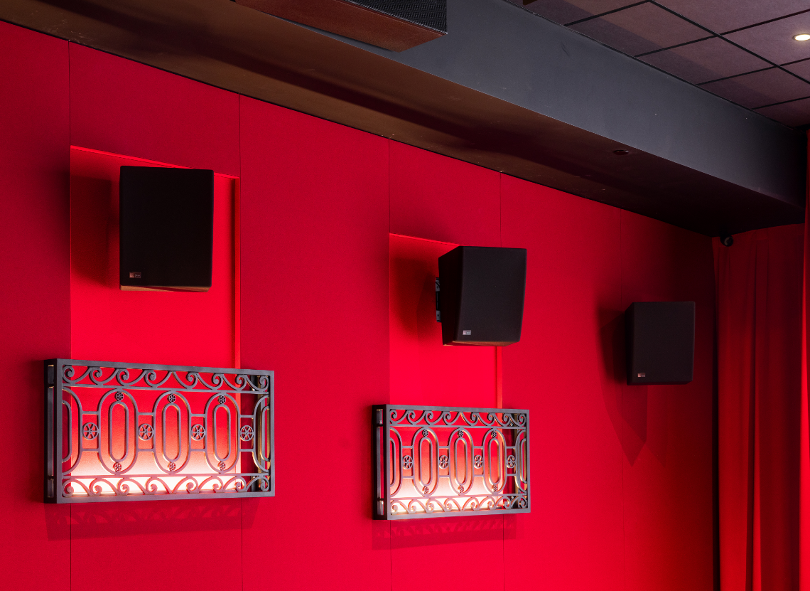Los tres auditorios Atmos están anclados por altavoces de canal de pantalla ASTRYA-140, con arreglos superiores ULTRA-X23XP y altavoces laterales HMS-10; las dos salas 7.1 cuentan con altavoces de pantalla Acheron Studio y sistemas surround HMS-5. Conjuntos de subwoofers de cine de alta potencia X-800C sirven a las cinco salas; subwoofers compactos USW-210P de perfil estrecho proporcionan gestión de graves en las salas Atmos.